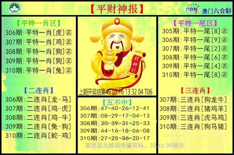 | 307期:七肖 | 猪马鸡羊猴鼠狗 | 开:狗20中 |